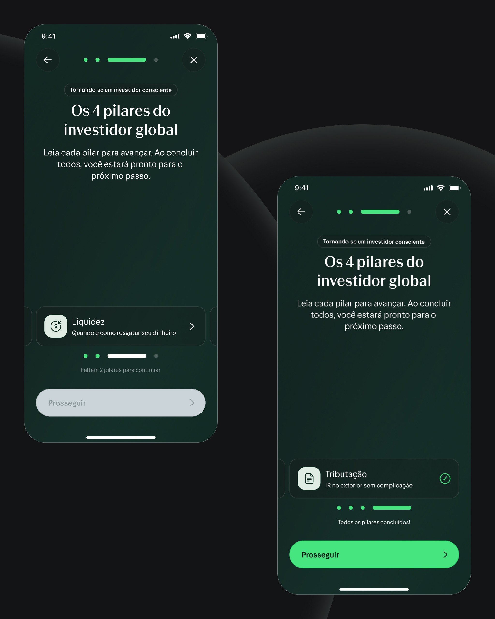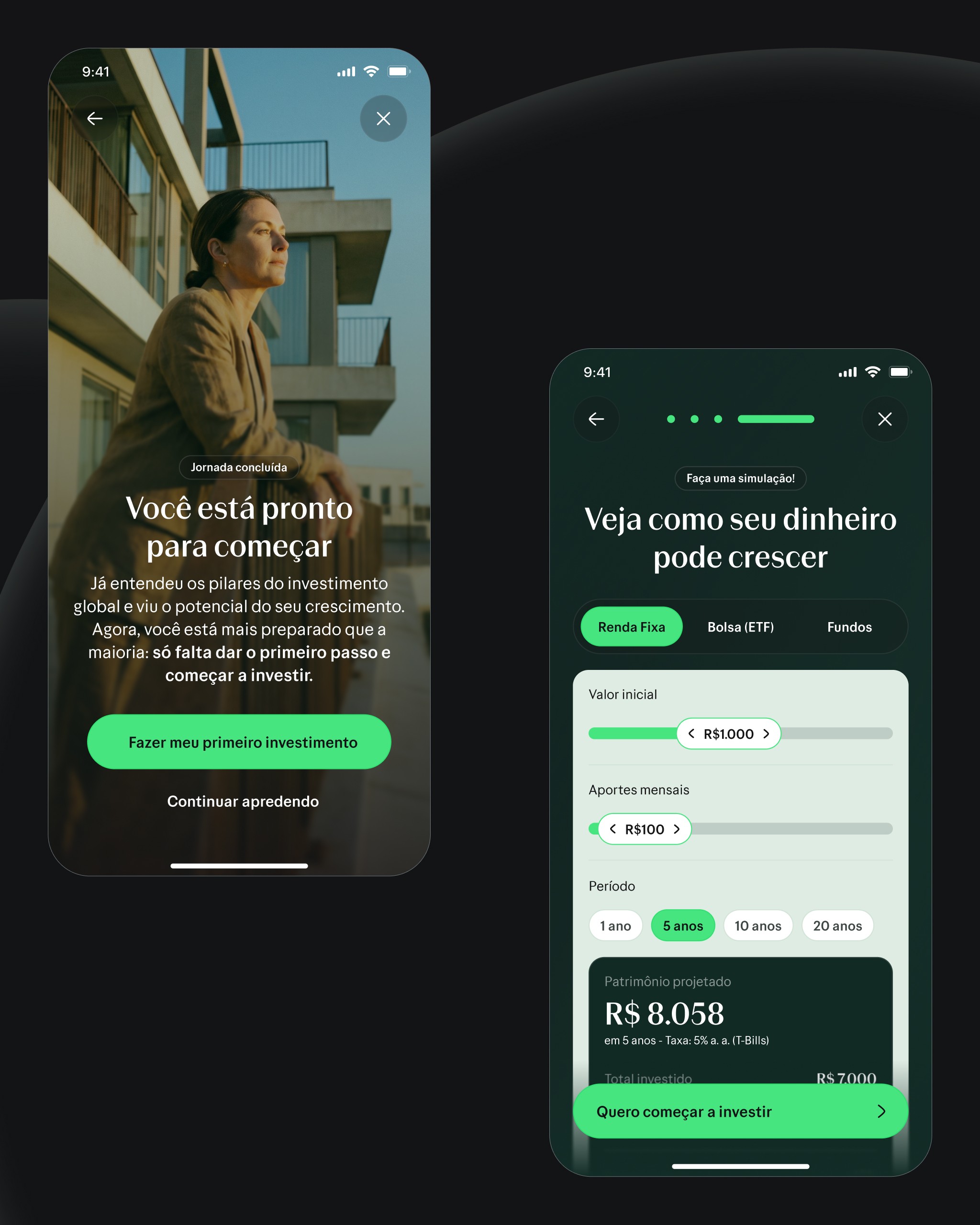 Um onboarding estratégico que atua diretamente no gap entre cadastro e primeiro investimento, reduzindo o abandono pós-ativação e aumentando a taxa de conversão de usuários que já estão na plataforma mas ainda não investiram.